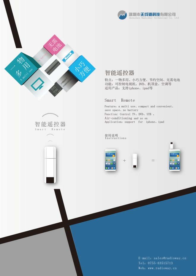 智能遥控器:可控制电视机、DVD、机顶盒等,适用于iphone、ipad、ipod touch。支持IR芯片6121系列、7461系列、9012系列、PHILIPS系列等
